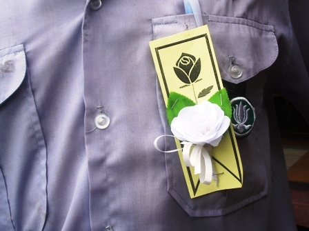Khi cài bông hồng trắng (biểu tượng đã mất mẹ) lên ngực,