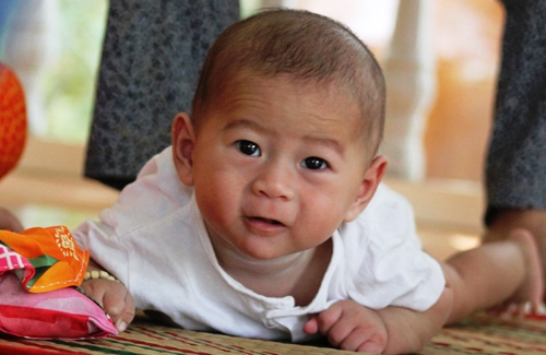 Hiện nay bé Quốc Huy khỏe mạnh và đã biết lật . Ảnh: Cửu Long.