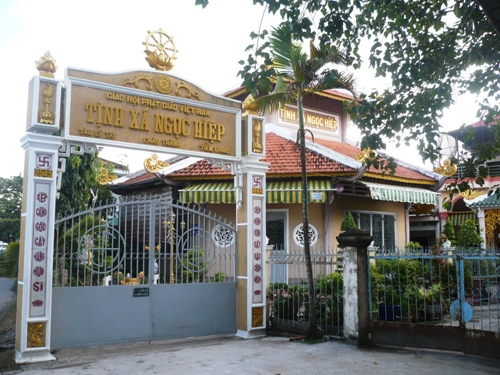 Xuôi Quốc lộ 1, qua khỏi Long An, vào địa phận Tiền Giang, vừa qua khỏi ngã ba Phú Mỹ có một bảng tốc độ thì xuống xe. Tôi làm đúng theo lời chỉ dẫn của Ni sư Tuyết, vừa bước thêm mấy bước thì đã thấy bảng Tịnh xá Ngọc Hiệp ngay bên đường quốc lộ. Điểm đặc biệt là bảng này có 2 tên, Tịnh Xá Ngọc Hiệp bên trái, bên phải bảng để tên Miếu Trung Nghĩa Thần, đều chung một địa chỉ ấp Tân Phong, xã Tân Lý Tây, huyện Châu Thành, tỉnh Tiền Giang.