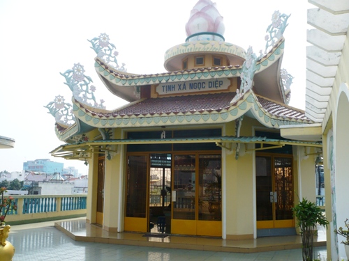 Một người lái xe ôm đã chở tôi từ Tịnh xá Trung Tâm qua Ngã tư Phú Nhuận, rồi theo đường Nam Kỳ Khởi Nghĩa đi để rẽ trái thuận chiều đường Lý Chính Thắng. Từ ngã tư vào khoảng 30m là đến Tịnh xá Ngọc Diệp. Nằm ngay mặt tiền đường Lý Chính Thắng, sát 2 bên là nhà dân nên Ngọc Diệp không rộng lắm, chỉ khoảng 8m ngang, do vậy tịnh xá đã được xây cao tới 4 tầng. Sau khi trả nón bảo hiểm và tiền xe xong, tôi đi vào tịnh xá, lúc đó là 9 giờ 20 phút.