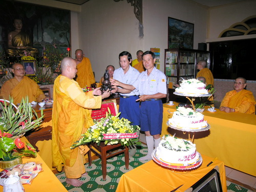 Đại diện Phật tử tặng hoa và quà chúc mừng Hòa thượng
